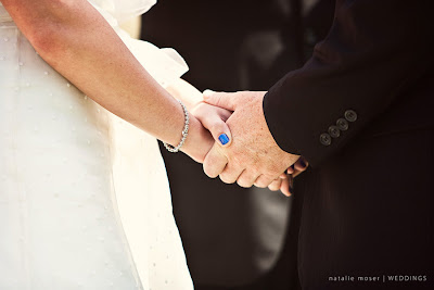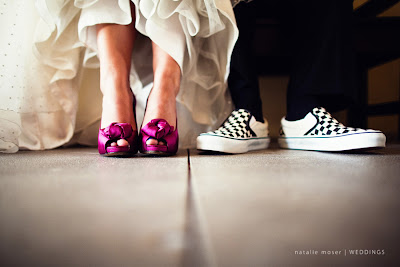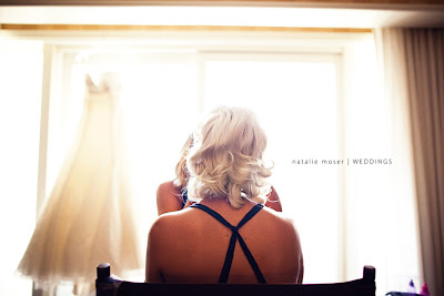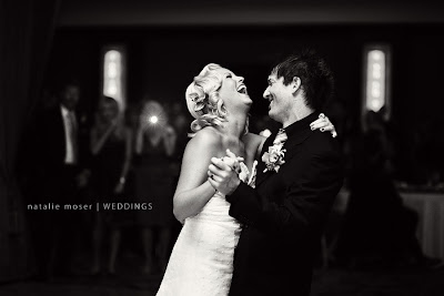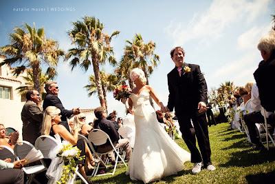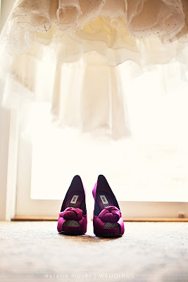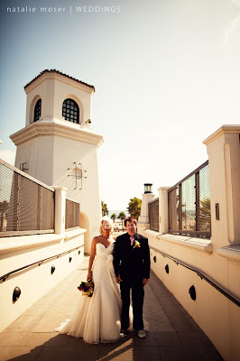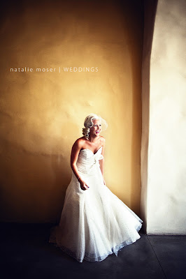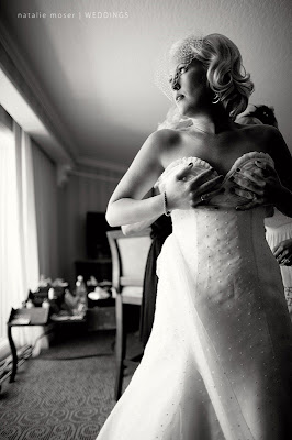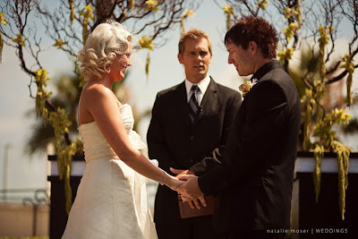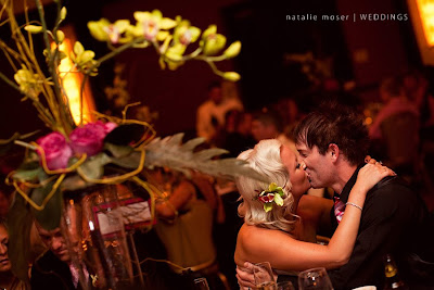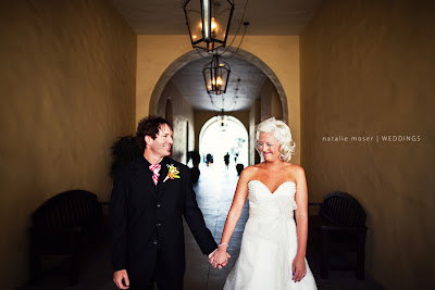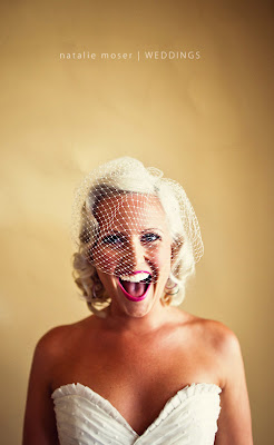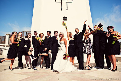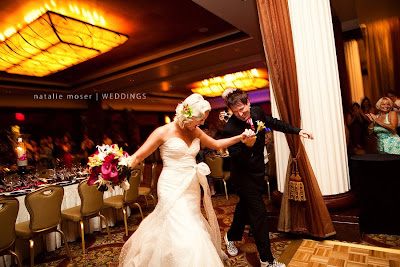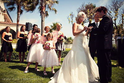 Danielle and Glenn's wedding, photographed by Natalie Moser, is not the kind of wedding I'd usually feature, but it's so beautifully coordinated and stylish that I couldn't help myself! Besides, all those shots of Dora were to-die-for. The pink and black Huntington Beach event was frankly fabulous, as was accessorizing her Dora with a classic birdcage veil. The bride and groom so obviously adore each other and had the most wonderful time celebrating with their closest friends and family. My favorite photographs were absolutely the portraits-Danielle is drop-dead gorgeous. That great image of Danielle grinning/saying "yippie!" actually placed top 20 in the Wedding Photojournalist Association's "creative portrait" category!