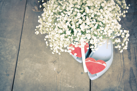 I am head over heels for this beautiful photograph, captured by Orange Passion Photography of British Columbia. Emily and Glenn's lovely wedding was featured in its entirety on the Wedding Chicks last week, but I couldn't get this image out of my head. The combination of the rough wooden planks, Vivienne Westwood's pop art peep toes and ethereal baby's breath is absolutely spectacular.a Bit of Baby's Breath