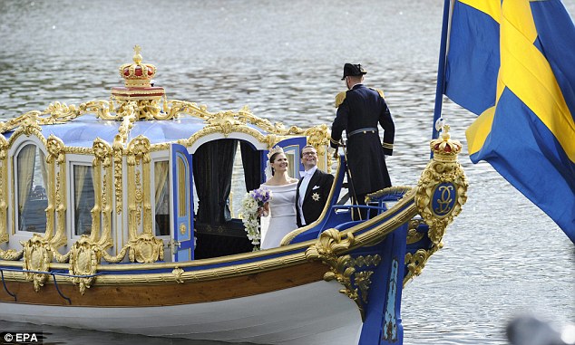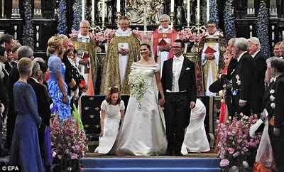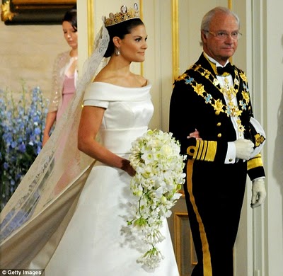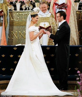 Over the weekend, European royals had quite an event to attend; Victoria, Crown Princess of Sweden was married to Daniel Westling in Stockholm Cathedral on Saturday. The four day wedding finally culminated in the union of the future Queen of Sweden and her former trainer. He owns the chain of gyms, but Swedes weren't always so sweet on the marriage. Over 1,000 guests were present, and four officiants presided over the ceremony. The bride wore an ivory silk, short-sleeved, off-the-shoulder gown, designed by Par Engsheden, and the same cameo-covered diadem her mother wore at her own wedding, exactly 34 earlier.