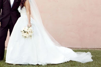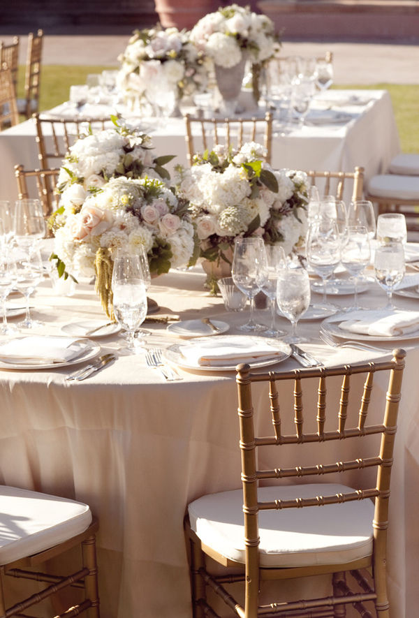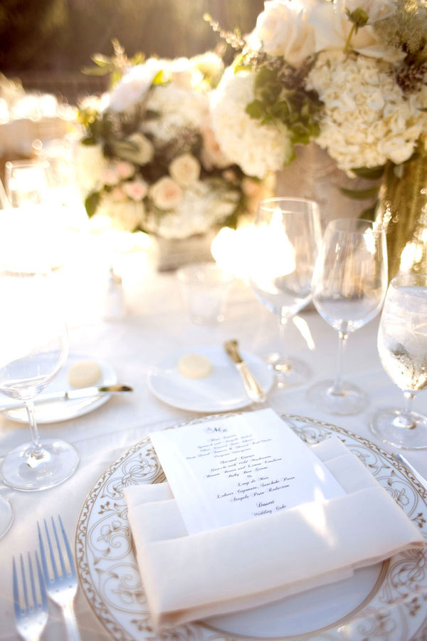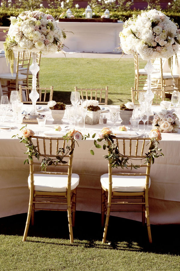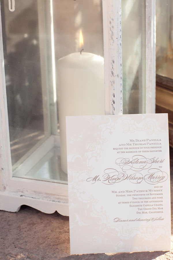 Adena is a bride after my own heart-she dreamed of an all-white wedding, and wedding coordinator Brooke Keegan delivered! The couple was married at the Grand Del Mar, a Mediterranean-style hotel in San Diego, CA in the on-site Elizabeth Capella. A cocktail hour on the terrace was followed by dinner on the lawn, and included some of the most jaw-dropping floral arrangements I've ever seen, provided by Elegant by Design. The rose-topped wreaths that decorated the bride and groom's chairs are absolutely breathtaking, and recall a garden party at Versailles. A jazz band accompanied dinner and dancing, and hundreds of lanterns light up the lawn as the evening drew to a close. Aaron Delesie captured every moment magnificently, and the guests never wanted to leave!