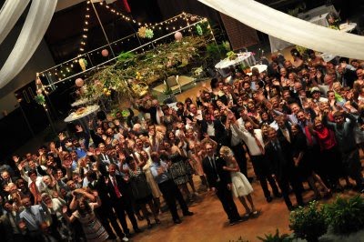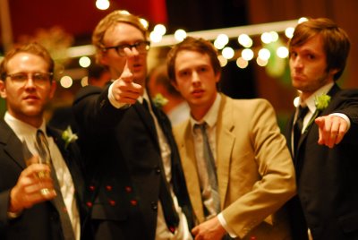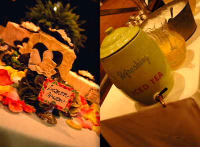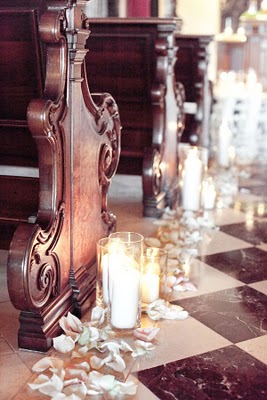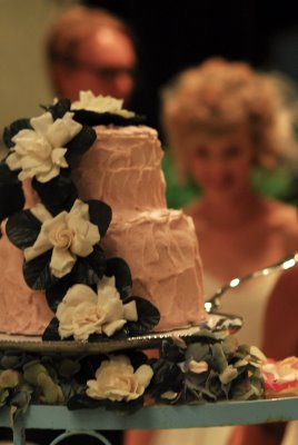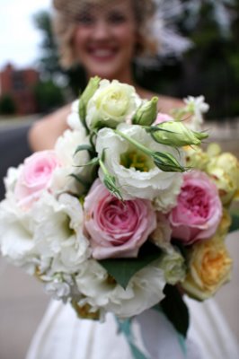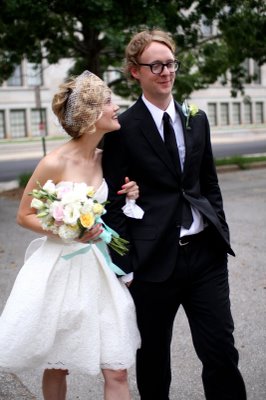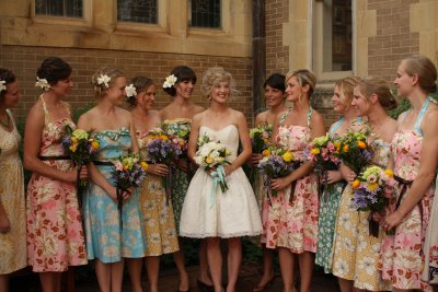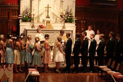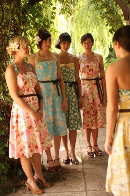 This adorable wedding felt like the perfect way to celebrate the end of June; charming flowers, sweet dresses and a whole lot of style! This Oklahoma celebration was truly a family affair; the bride's parents (and their parents, and their parents before them) own Mann's Flower Shop, so Katie and her parents designed the centerpieces, Mom did the bouquets and Katie's older brother took care of ceremony decorations. The bride wore a gorgeous Ramona Keveza dress (from the Fall 2008 Legends collection), while all ten of her maids wore frocks her mom sewed from vintage Vogue patterns circa 1950!
