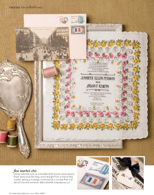 Bird and Banner dreams up some of the most charming wedding stationery on Earth; they've taken the art of paper to a new level by printing on gorgeous vintage handkerchiefs. The one above was featured in Bride and Bloom magazine, and since I spotted it, I've been on the hunt for the perfect bouquet to pair it with. Kellie's bouquet, designed by La Partie Events and photographed by Erin Hearts Court fit the bill to a turn!