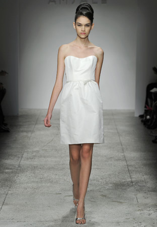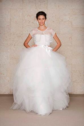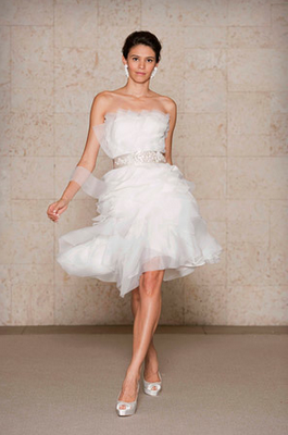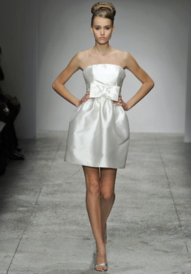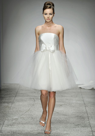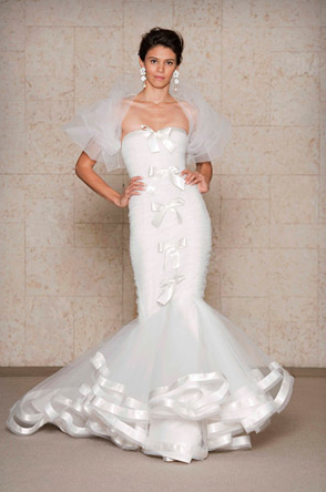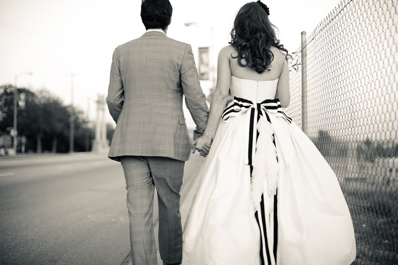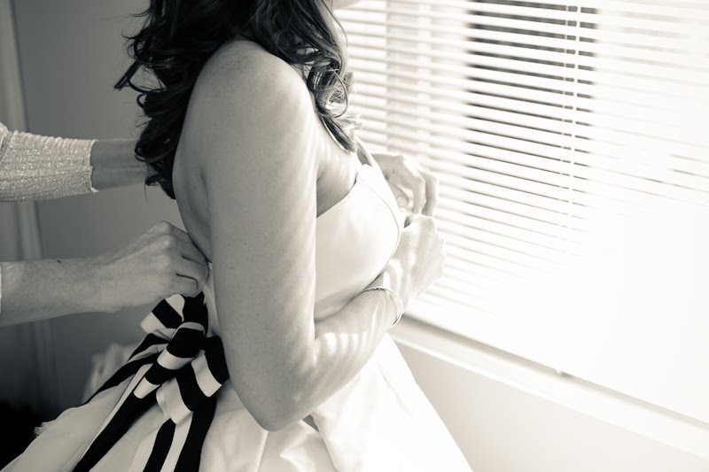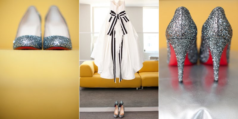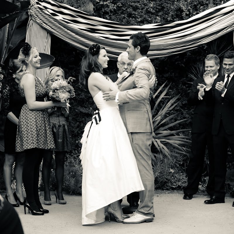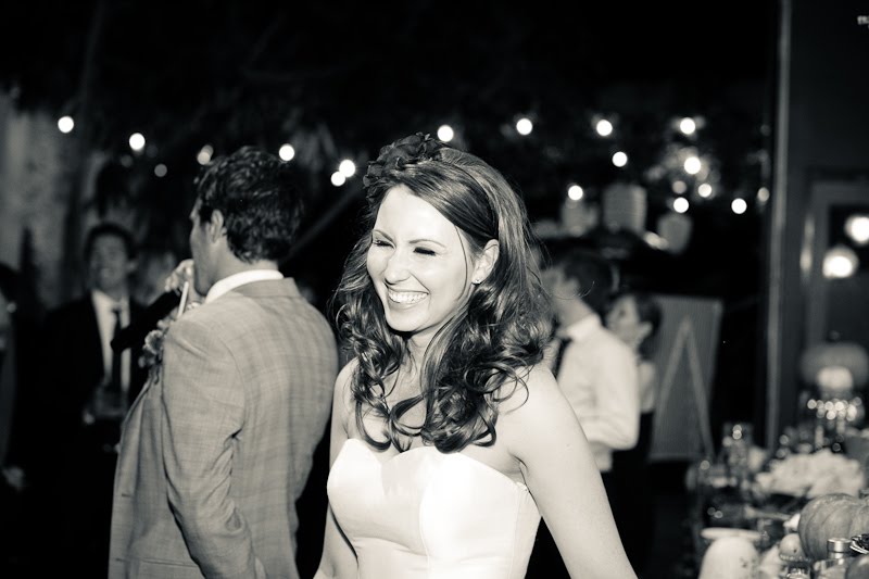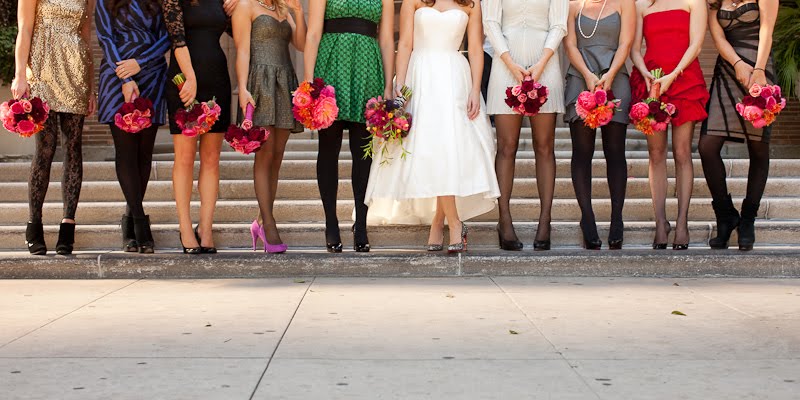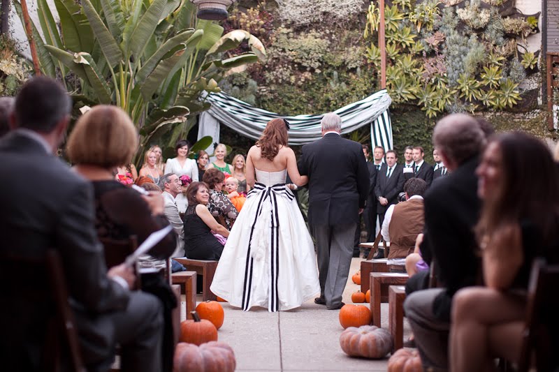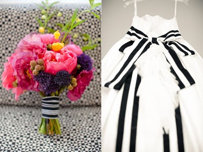 I have a confession to make about this wedding-I have been saving for almost a year, especially for today! Mary and Stefan's wedding took place on Halloween, so I knew as soon as I saw it that no matter how delicious, it would simply have to wait until the perfect day. I hope that seeing it now, you agree!So many beautiful weddings begin with an amazing dress, and this gorgeous bride's gown is a knockout. Mary designed it herself and comissioned Monaco Couture to execute this fashion forward gown with a sweetheart neckline, asymmetrical hemline and fabulous black and white bow. Along with a pair of sparkly Christian Louboutins and a Juicy Couture headpiece, Mary looked absolutely phenomenal, and she made sure her groom looked equally sharp in his Prada suit and coordinating black and white striped bow tie. This generous bride also gave a lot of thought to her maids' outfits, and was inspired by a May 2008 issue of Vogue to give the girls free reign. Obviously if you have such chic girlfriends, there's no need to make them match! The only girl she dressed was her flower girl; wearing an orange tulle tutu by Lily Anna for Girls, she made the most adorable pumpkin of the night!