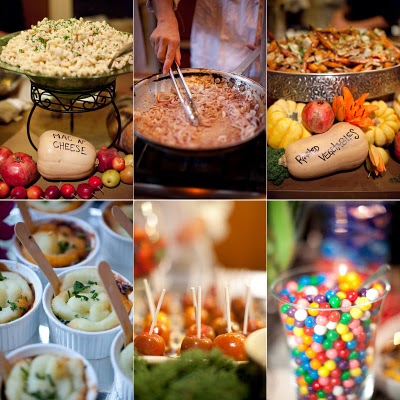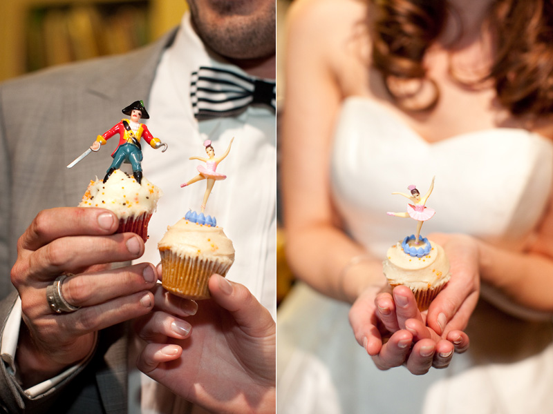 The caterer, Auntie Em, made British-inspired hors d'oeuvres like mini shephard's pies as a nod to Stefan's heritage, and served a family-style buffet at dinner that kept conversation flowing. Mini caramel apples and Halloween candy were a sweet touch, and the bride and groom skipped a traditional wedding cake in favor of cupcakes topped with charming ballerina and pirate figurines, spotted at a local knick knack store for 75 cents a piece!