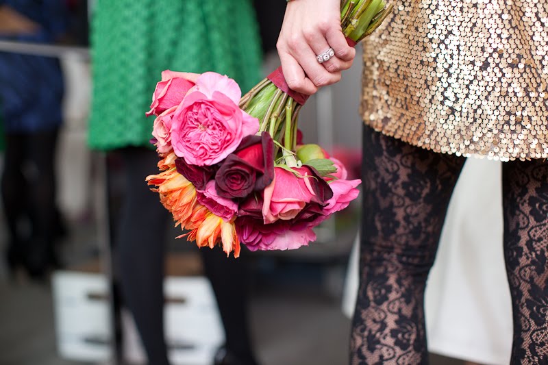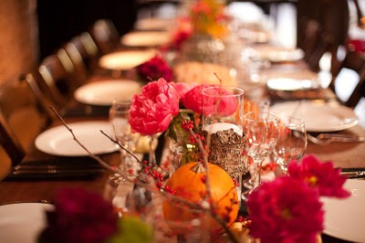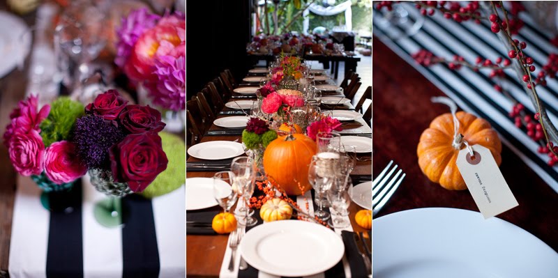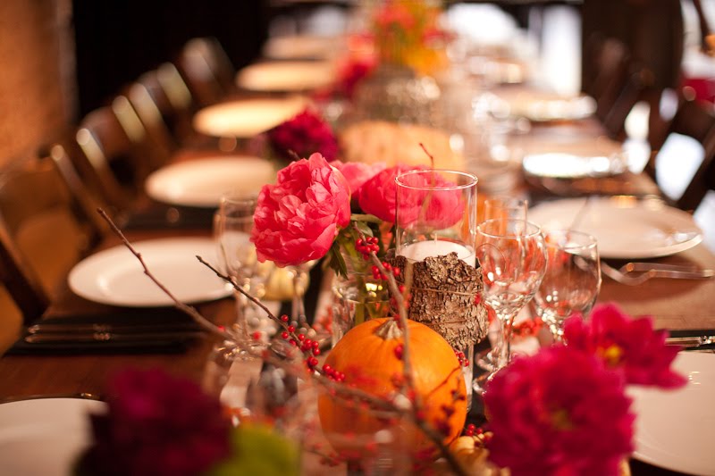 At the reception, pumpkins and black and white stiped runners echoed the ceremony space, and punches of bright color kept the tables looking splashy. Bright coral peonies, orange parrot tulips, deep pink and red roses and dahlias and red and orange berries gave the arrangements life and texture, and were nestled into mason jars, goblets and mercury glass vases.