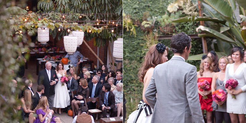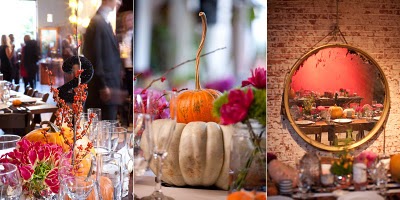 Of course, a Halloween wedding could have fallen victim to all-pumpkin centerpieces and cauldrons of wine, but Mary and Megan of La Partie Events (who coordinated the event and designed all the flowers) made sure this autumn wedding was nothing but chic. In the ceremony space, large cloth lanterns, draped fabric that echoed Mary's sash and Stefan's bowtie and a pumpkin-lined aisle gave the space a playful, modern take on Halloween.