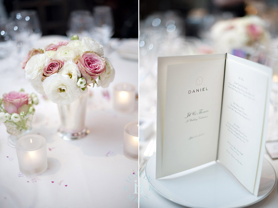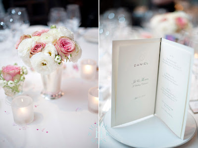 These lovely arrangements of ranunculus and garden roses are stunning; I always chose low, full blooms over tall, more structural centerpieces. And who can resist the simplicity of that menu-so chic!Photo by Justin and Mary Marantz.