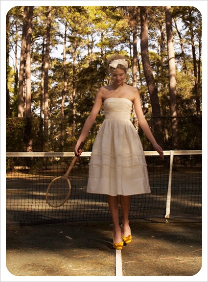 Here, the photo (plus a few others for good measure) that had me daydreaming about canisters of Prince balls and tennis whites! I must say, I think a tea length wedding dress might just be the best white I've ever seen on the court, and those goldenrod slingbacks are certainly a pair to write home about!Photos via BHLDN.