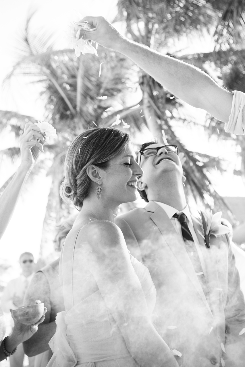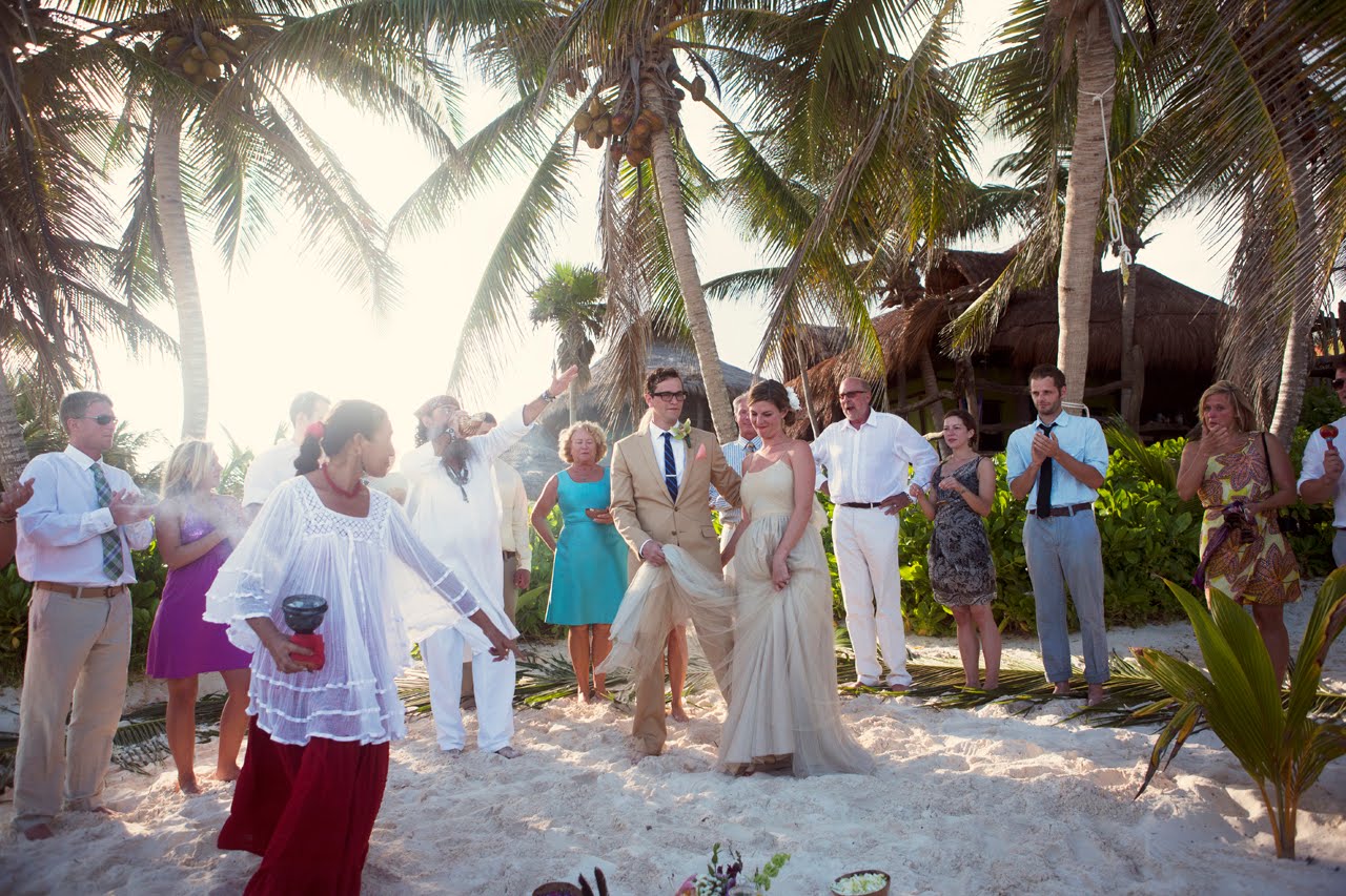 Just because a girl's on vacation doesn't mean her love of weddings takes a back seat. In fact, I spent plenty of time in Mexico dreaming about gorgeous destination wedding set against the crystal clear ocean and white sand beaches, and this celebration was my dream come true!The couple chose Tulum for its beauty, and invited 40 guests for a week of wedding festivities that spanned Halloween. They were inspired by traditional Mexican culture and the stunning setting, and incorporated folk art, tropical leaves and white sand. Rick Leech and Damien Riddell, friends of the newlyweds, designed the save the dates and invitations, dotted with colorful papel picado flags and banners; the couple made sure similar flags and banners from Ay Mujer! were hung around the Cabanas La Luna.