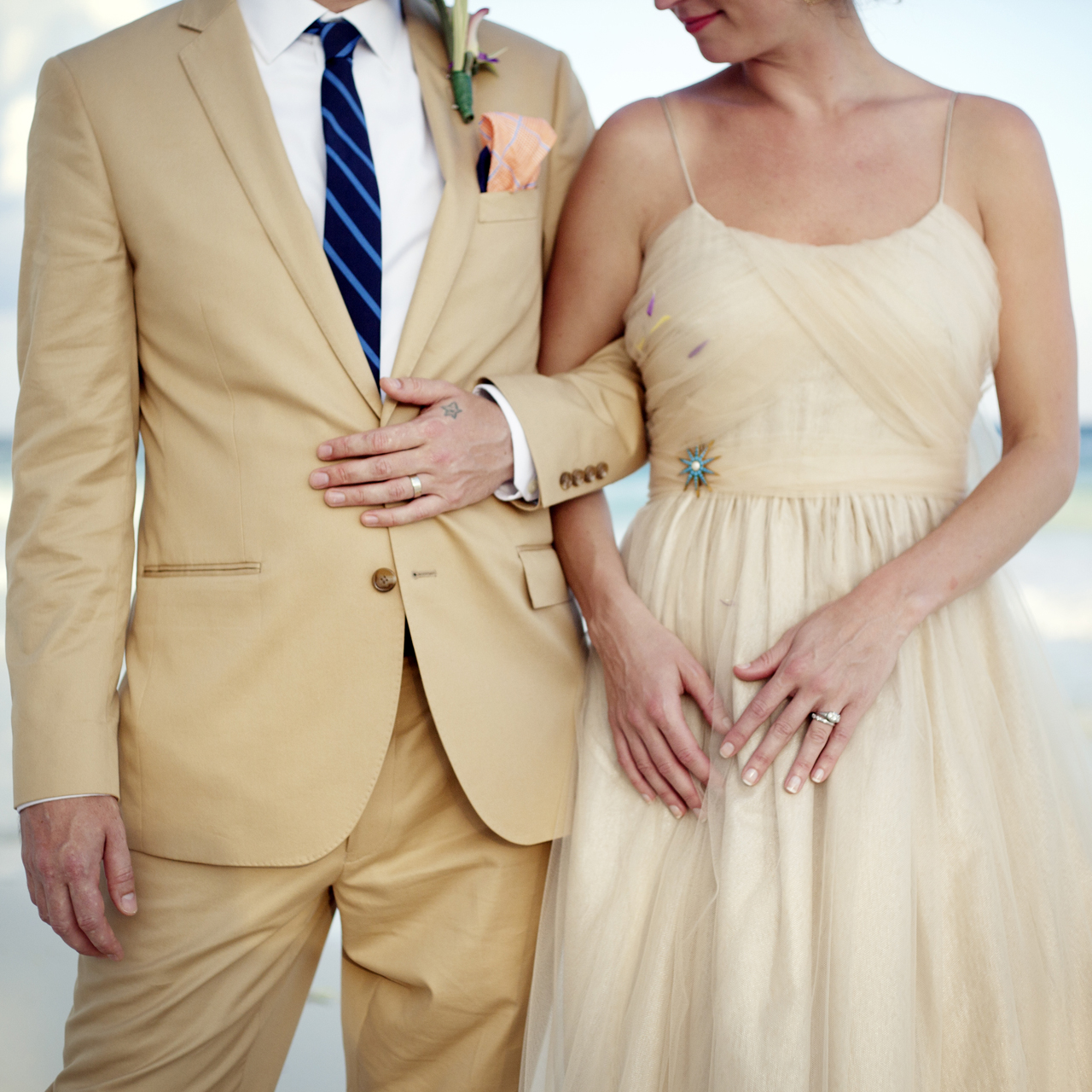The bride and groom wore J.Crew; Nicole chose a French tulle gown in a perfectly sandy shade and fastened with a vintage pin made by her grandfather that has been passed down through generations in her family. She also wore a flower in her hair, made for her by the Silver Moon. The newlyweds exchanged platinum bands made by a close family friend and a protégé of the bride's grandfather.