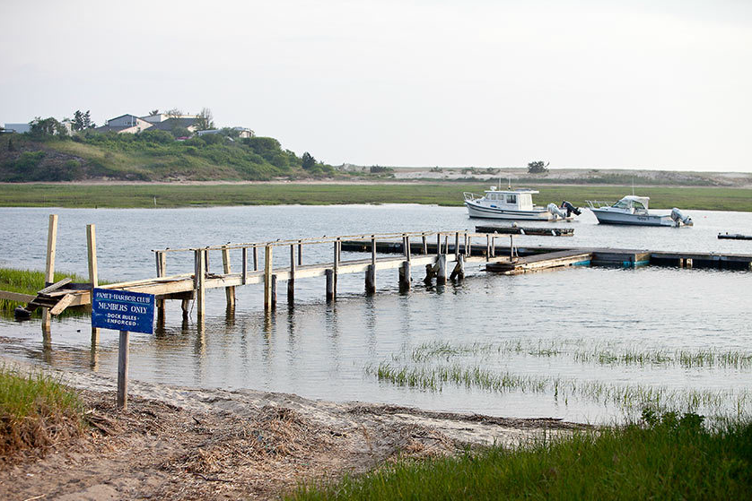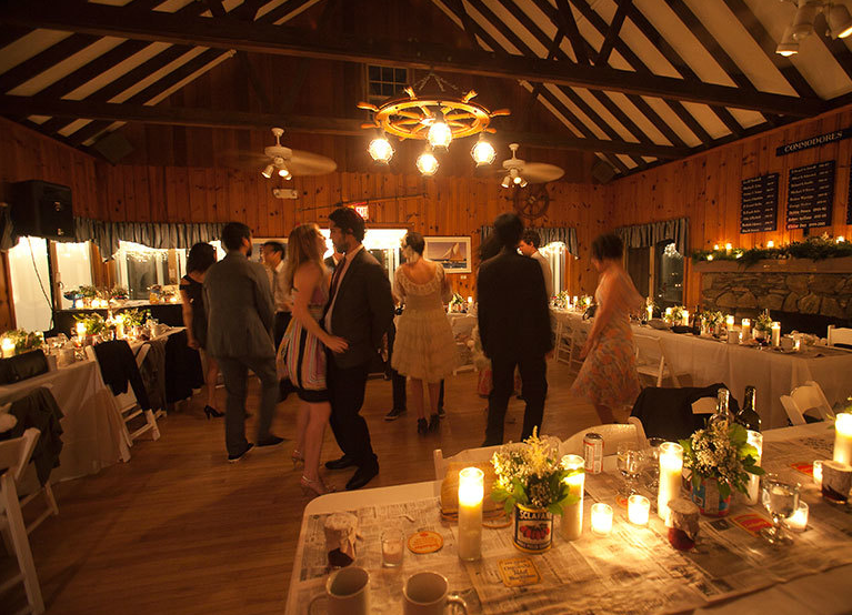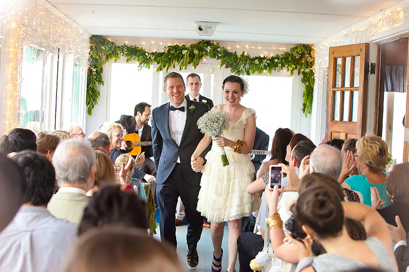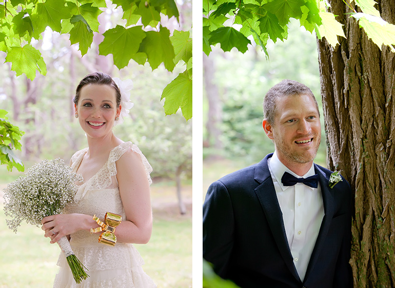 Since rain threatened their plans for an outdoor ceremony at the Pamet Harbor Yacht Club, the vows were moved indoors. Hannah and her friends collected greens from the side of the road and one of her friends constructed the garland just hours before the ceremony! The bride's engagement ring was from Excalibur Jewelry, and the pair exchanged wedding rings from Doyle & Doyle and St. Kilda. A Cape Cod florist made Hannah's baby's breath bouquet, along with the wildflower-inspired boutonnieres, while the bride and her friends arranged the simple centerpieces.