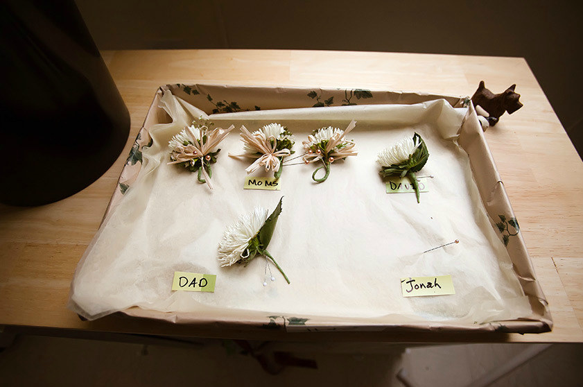 The crafting started with the couple's invitation suite; Hannah, inspired by an old card, created a custom rubber stamp and "printed" the save-the-dates and invitations on paper from Kate's Paperie! She also chose a vintage dress from the Pasadena City College flea market for $50 that she altered herself, so a splurge on her "something blue" Loeffler Randall shoes and gold bow cuff from Alexis Bittar was well-deserved! The groom wore a J.Crew suit, Pucci bowtie and a pair of Tretorn sneakers you can be sure got plenty of mileage long after the big day!