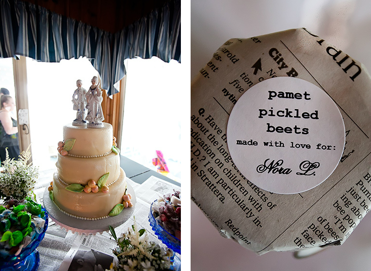 Cosmos catered the intimate reception, serving a clambake, lobsters and a raw bar, and Hannah and Jonah chose a Pimm's Cup as their signature cocktail-recipe is forthcoming. A marzipan cake topped with porcelain figures was whipped up at the Danish Pastry House in Boston, and guests took home jars of Jonah's homemade pickled beets, wrapped in newspaper that echoed the newsprint table runners.