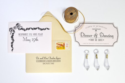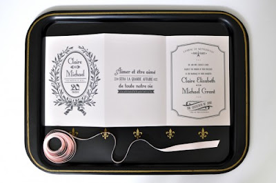 In case you Francophiles didn't get quite enough of macarons and ribbon yesterday, here's just a bit more Eiffel-tower inspired loveliness! First spotted on Oh So Beautiful Paper, this suite designed by Coral Pheasant was part of a gorgeous collaborative project. Tucked in a shimmering golden envelope lined with green and gold leaf rice paper, the blush colored trifold invitation was wrapped in golden cording and pale pink satin ribbon. If the Ladurée-inspired illustrations doesn't knock you off your feet, I don't know what will!