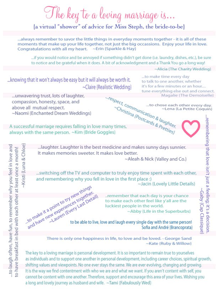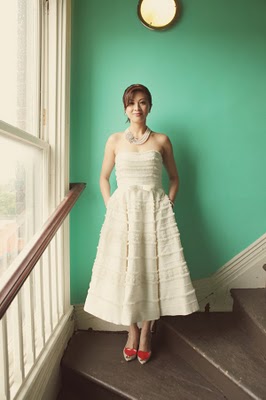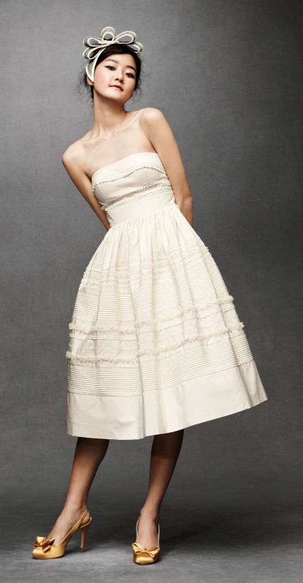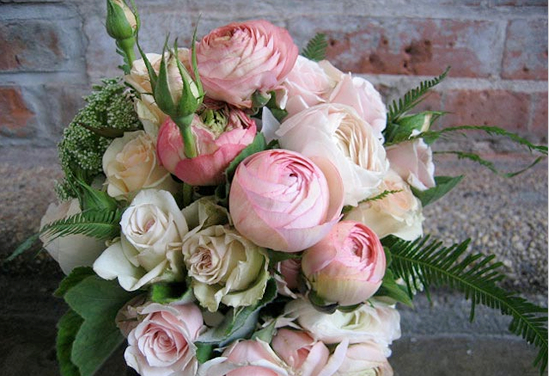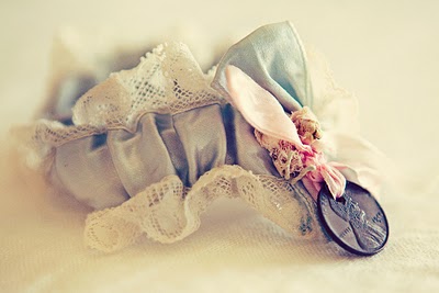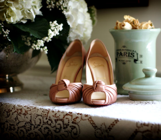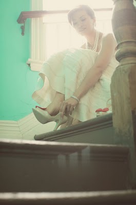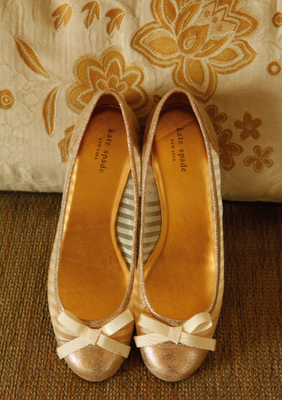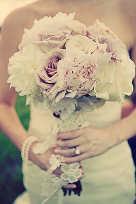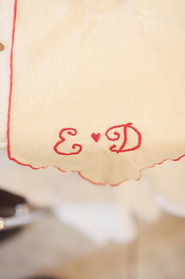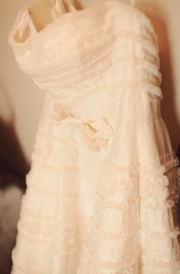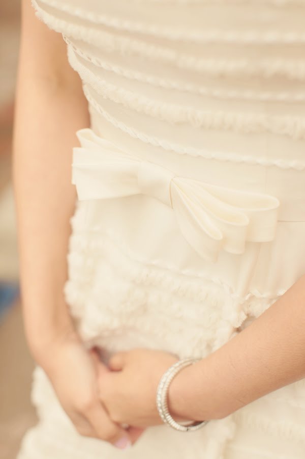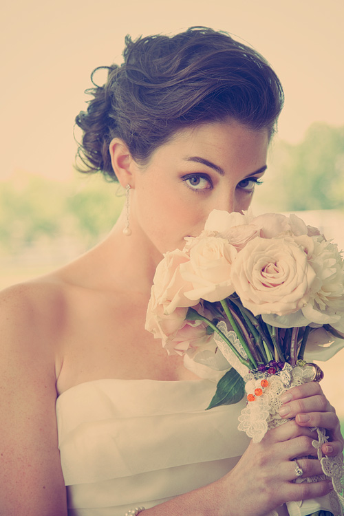 Vera Wang gown and two garters, one her grandmother's garter worn in 1951, with the original penny still sewed on. Her bouquet was tied with her grandmother's handkerchief and wrapped with lace from her mother's wedding hat, in a nod to her family's many happy marriages. Bridesmaids wore