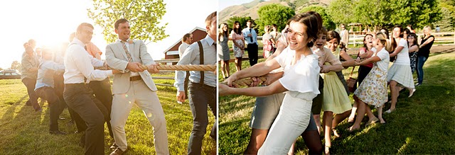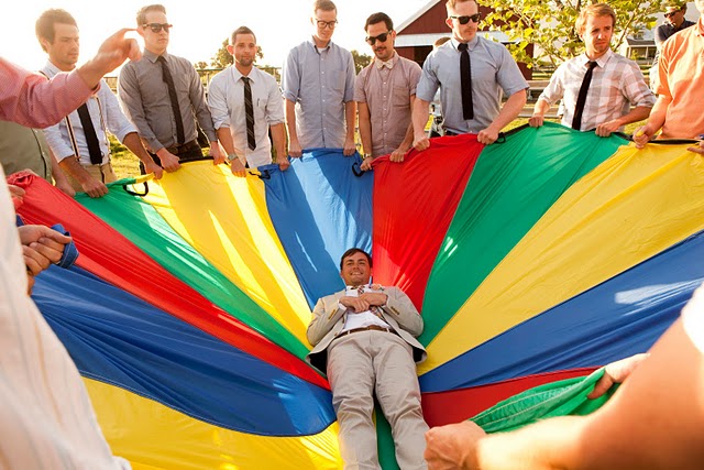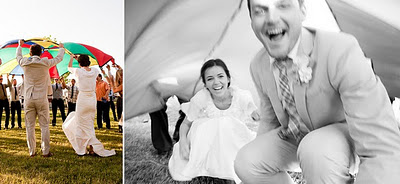 After the ceremony, the couple played lawn games like croquet and bocce ball with their guests, and encouraged everyone into canoes and paddle boats in the pond behind the barn. They also rented a giant parachute for the big day, and not surprisingly, being tossed up in the air by their friends was a highlight for the bride and groom.