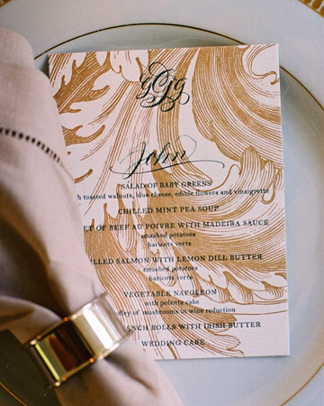 With the help of designer and coordinator Jennifer Carroll, Greg and Ginger planned an elegant garden ceremony and a dinner for 150 guests under a tent on the manicured lawn. Invitations, printed with a sepia-toned feather designed by Amy Graham Stigler for Bella Figura, introduced the pair's triple-G monogram, for their first names and shared last initial, and featured calligraphy by Heather Rolfe of Heather Belle Ink. Ginger wore a creamy embroidered lace mermaid gown from Priscilla of Boston, paired with ornate drop earrings and her lush peony bridal bouquet by Pat's Floral Design. Her bridesmaids wore blue, while Greg and his groomsmen looked dapper in their best tuxedos.