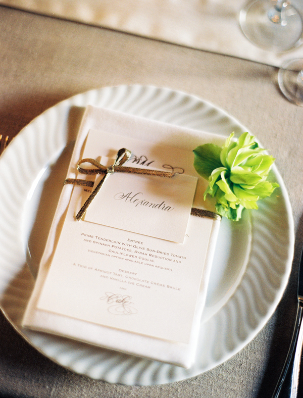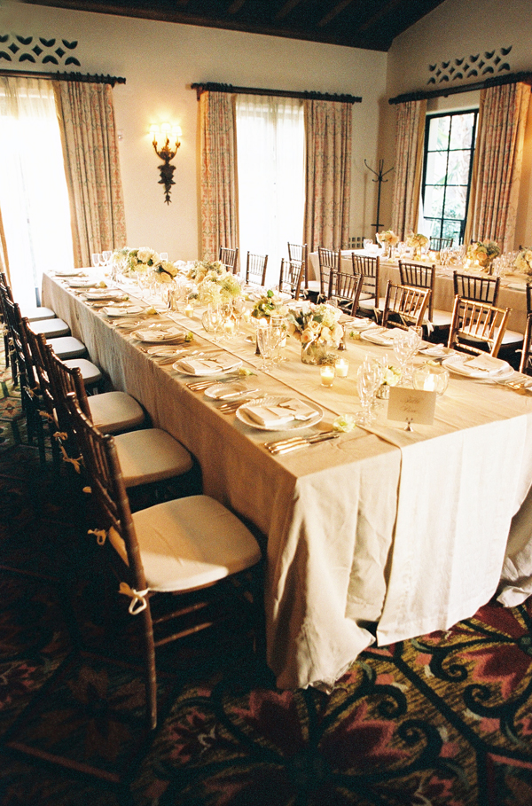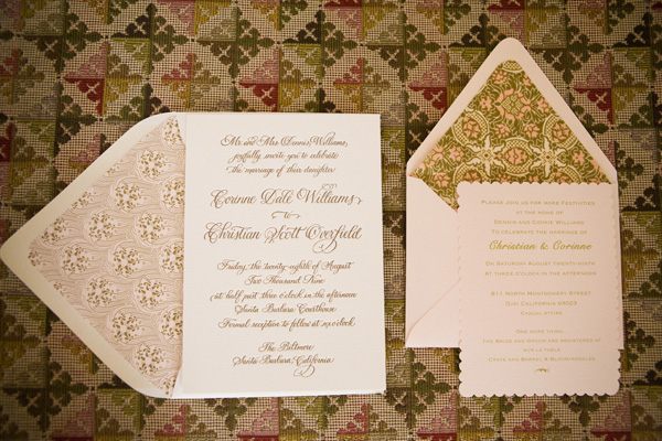 After selecting the stunning Mural Room of the Santa Barbara Courthouse for their ceremony, the pair decided that the Old World Spanish style of the Four Seasons Biltmore Hotel was the perfect compliment to the bride's love of heirloom flowers and soft, subtle shades. Announcing the wedding's elegant atmosphere, Corinne worked with calligrapher Renée Troy to create a custom letterpress suite with linings inspired by decorative Spanish tiles and tapestries.