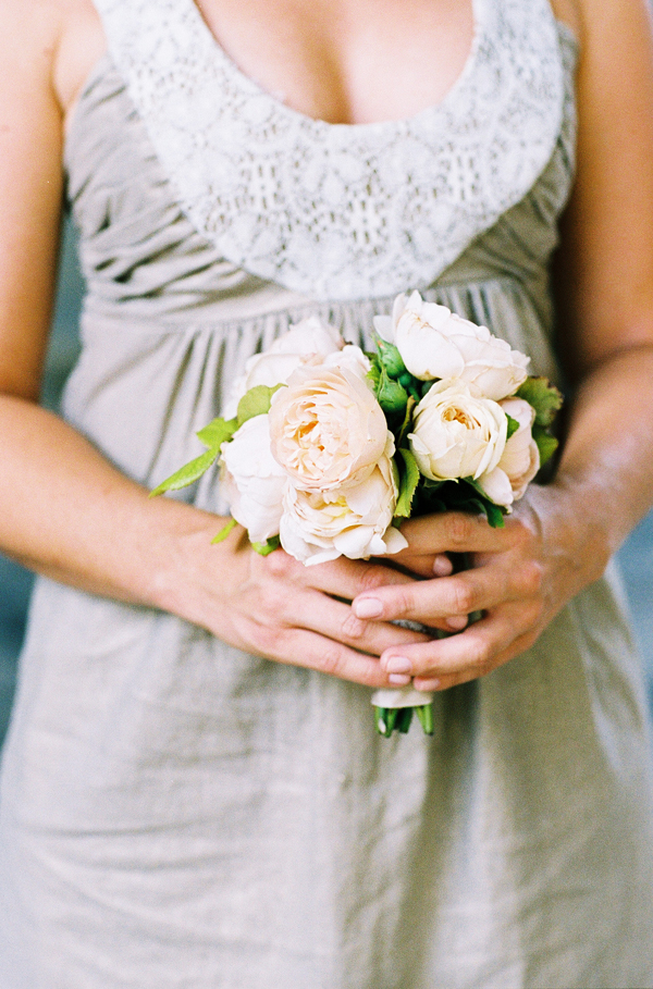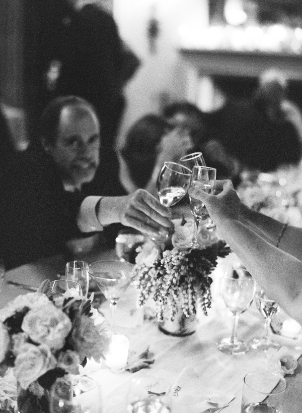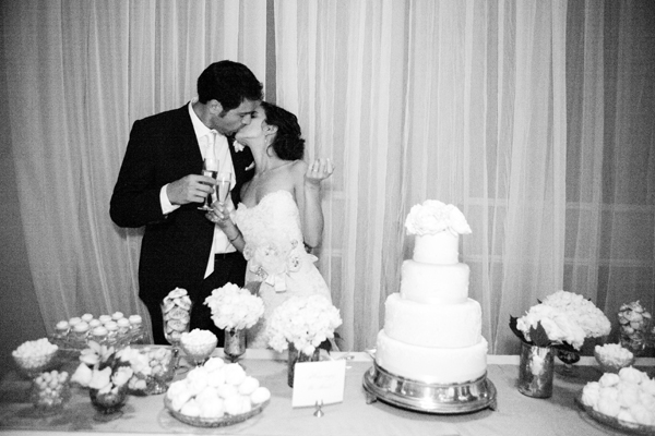 After a joyous ceremony, guests made their way to the Biltmore Hotel for California cuisine and more gorgeous blooms from Flower Wild. Arrangements of ruffled roses, café au lait dahlias, Queen Anne's lace, ranunculus and dusty miller graced each table, along with votives full of flickering candlelight. The bride's mother embroidered each guest's name on a hem-stitched linen napkin, which served as escort cards, and she stitched together the couple's fabric "guest book" into a beautiful quilt. Homemade cookies and local wildflower honey were sweet treats for guests, but not sweeter than the father-daughter dance; after major surgery, he set aside his pain to twirl his beautiful daughter on the dance floor. Following heartfelt toasts at the open mic, guests enjoyed a Robyn Loves Cake confection modeled after the bride's gorgeous gown, captured sublimely by Susan Dean Photography and first spotted on Style Me Pretty.