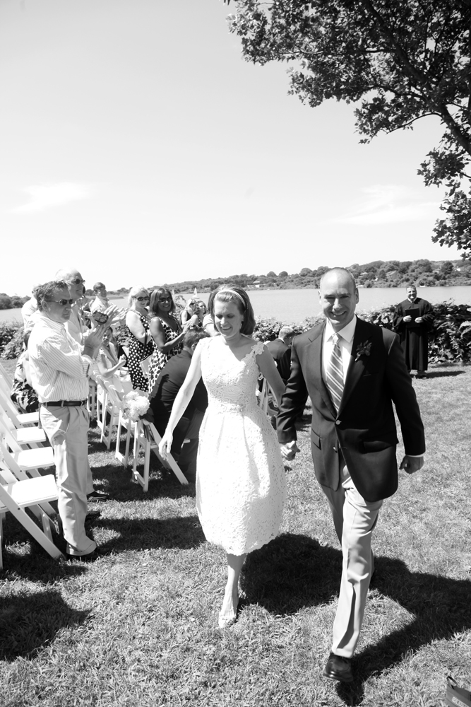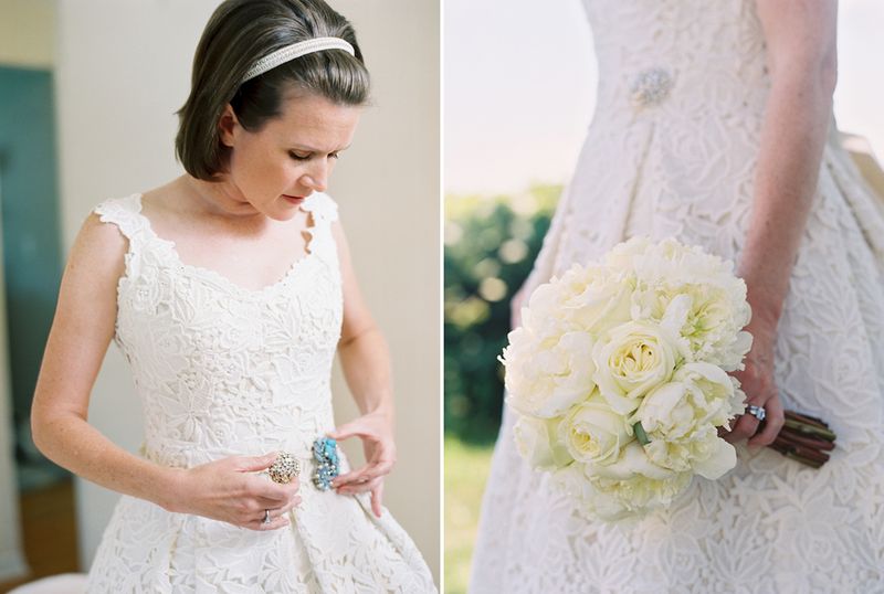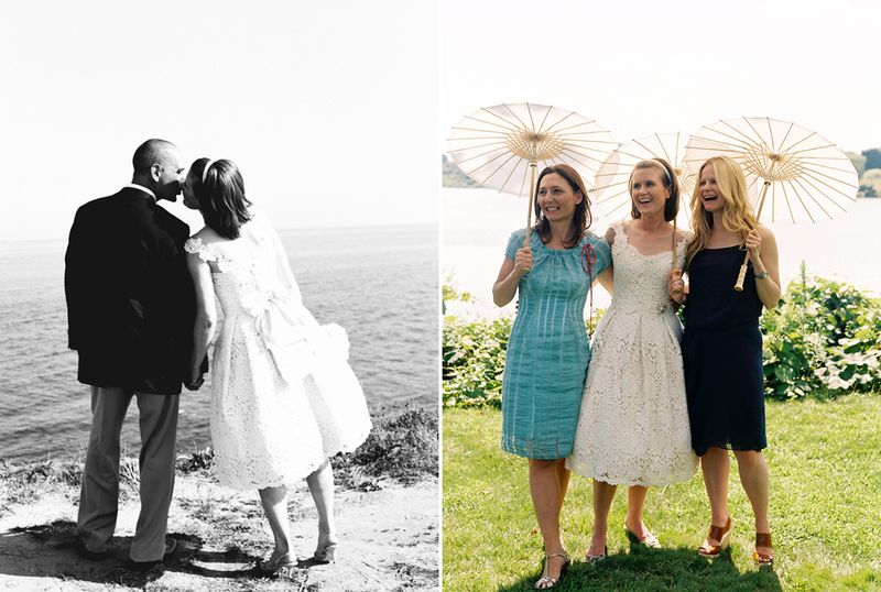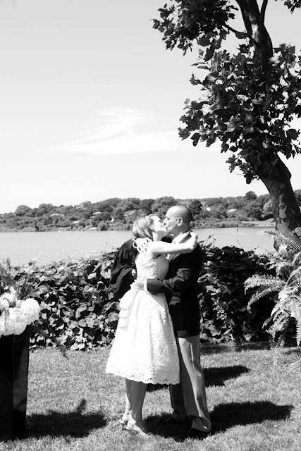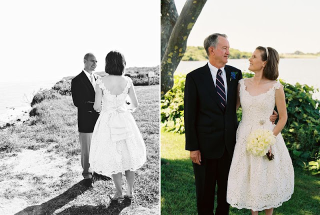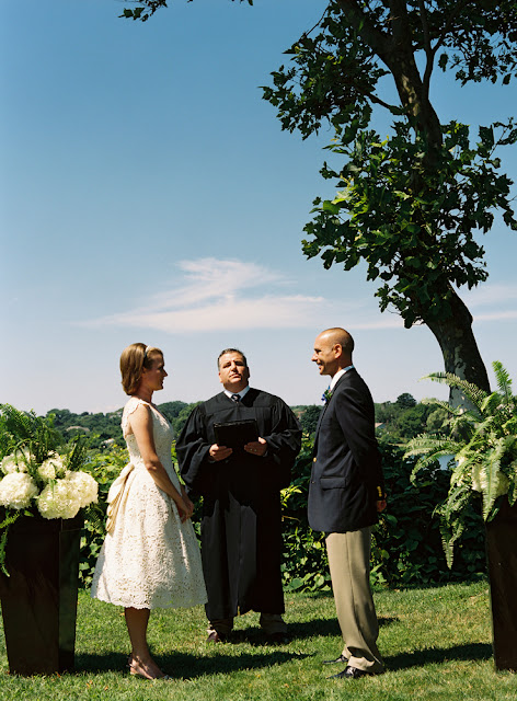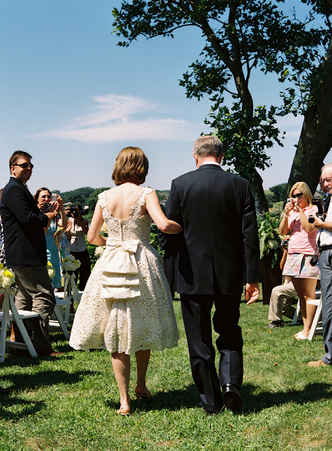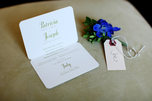 Patty wore a tea-length lace dress by Christina Kara of East Village's Blue with a cluster of vintage brooches and beautifully embellished Rene Caovilla sling backs, while Joe wore khakis and a navy blazer in classic New England style. The bride's full bouquet of white peonies complimented the crisp, colorful table arrangements by Karen Lenahan Design, and the darling baumbirdy signs and programs. And of course, thanks to the work of the incomparable Karen Wise and her assistant, Joan Cuenco, we can enjoy the most beautiful window onto this joyful day. Karen was generous enough to share these gorgeous images with me, and I hope you're feeling as inspired as I am!