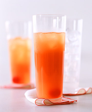 Combine all ingredients in a pitcher with ice; stir well. Serve in tall glasses with fresh ice, garnished with a maraschino cherry.