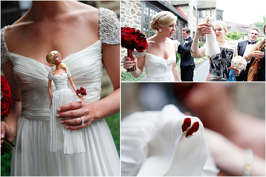 A lucky bride wears Reem Acra and Christian Louboutin, but a very lucky bride is gifted her very own bridal Barbie! Aren't those red soles irresistible?
