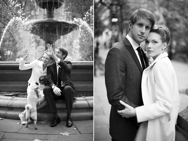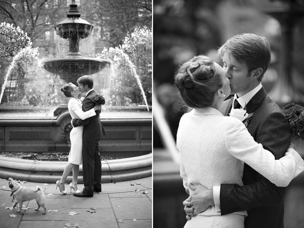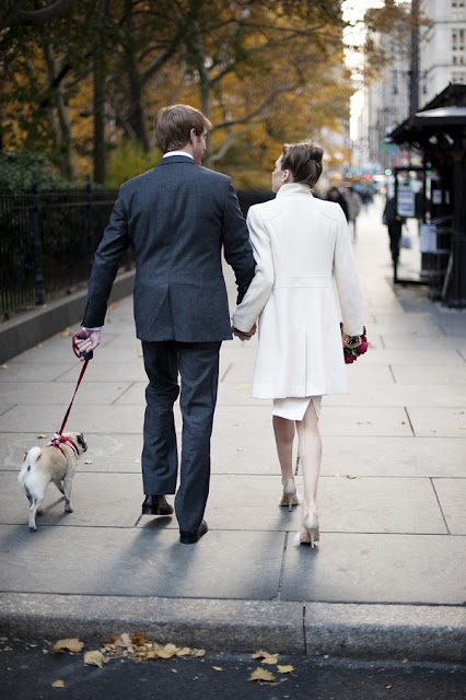 skirt that floored John), then brought along their adorable pug for an outdoor ceremony at City Hall Park. After exchanging rings, the newlyweds indulged in a celebratory dinner at Bubby's and found themselves embracing in the autumn rain.