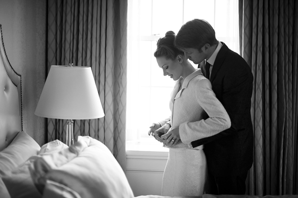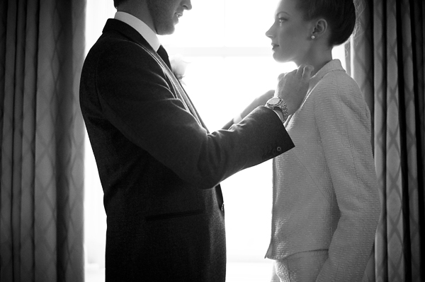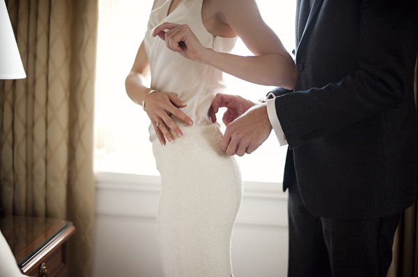 I knew this wedding was a winner when John, looking over my shoulder, said "That's gorgeous." And boy is it ever. Mel and Geoff meet as NYU undergrads and tied the knot in the Big Apple with their photographers, Justin & Mary Marantz, also serving as witnesses. The pair dressed at The Pierre Hotel (it was the image of him zipping up her vintage Armani