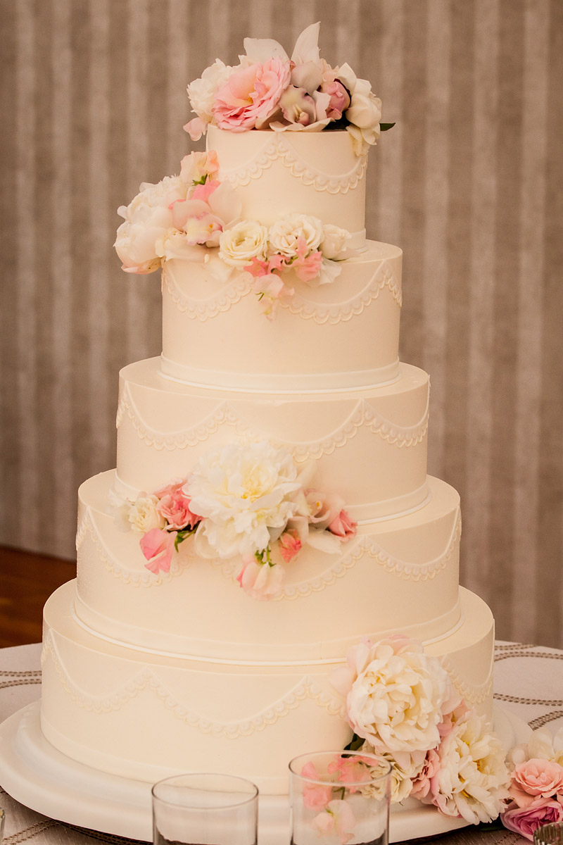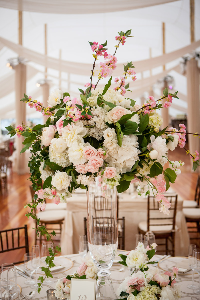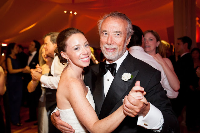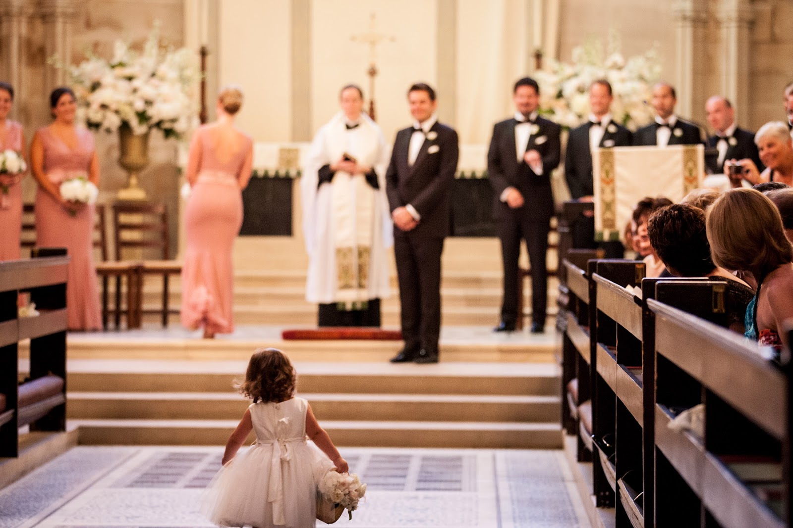 Vogue's Senior Accessories Editor, Rickie, is also the daughter of Tom Ford International chairman, so there was no question about who'd design her gown. The strapless organza and lace dress was perfectly accessorized (naturally) with diamond drop earrings, a Cathedral veil, white satin peep toes and a gorgeous white bouquet by Sayles Livingston. The bride wanted blue for her six bridesmaids, but Mr. Ford suggested pink might be more appropriate for summer; they agreed on "blush" when Rickie wrinkled her nose at pink! Derek and his groomsmen looked handsome in black tie, and white rose boutonnieres distinguished them from the rest of the well-dressed guests.