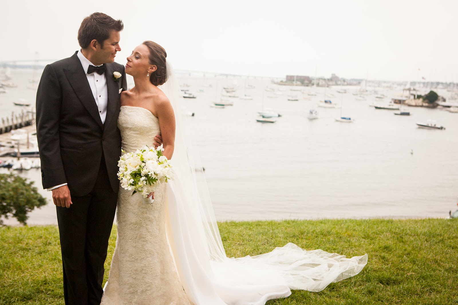 paired with gold-banded china and white and blush arrangements by Sayles Livingston, and after a slice of cake from Confectionery Designs, guests were treated to a fireworks display over Narragansett Bay. The bride slipped into a lace Valentino dress for the sparkler send-off, and the newlyweds, who met on the Georgetown sailing team, headed to their after-party in a darling Hinckley picnic boat.