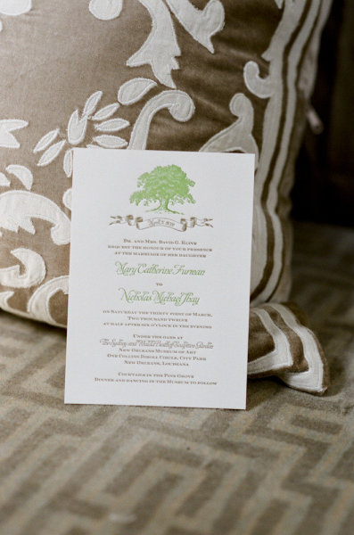 I've never visited the New Orleans Museum of Art, but this wedding certainly makes me anxious to attend an event there! Michele and Brittany Adams of Unique Weddings in New Orleans helped this couple plan a classic celebration that reflected their style and highlighted the stunning venue, starting with a letterpressed invitation featuring the tree beneath which these two tied the knot.