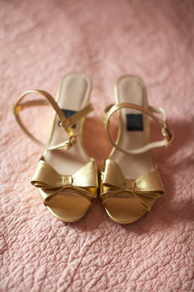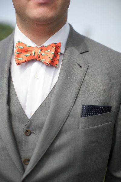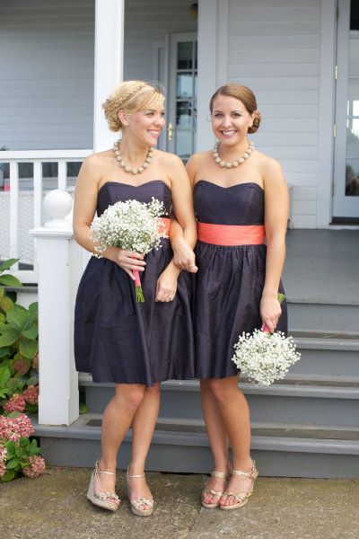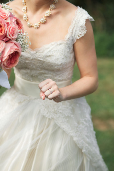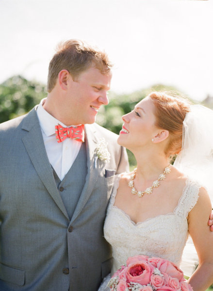Mary wore the lace gown both her mother and grandmother had worn, beautifully restored by Ann Hamilton. Gold Milk & Honey sandals paired with a pearl and crystal necklace, pearl studs and a tulle veil. Her bridesmaids looked darling in navy LulaKate dresses with coral sashes, and their baby's breath posies by La Bella Rose matched the bride's pink garden and spray rose bouquet. Harold wore a made-to-measure three-piece suit, and he and his groomsmen looked dapper in Southern Proper bowties.