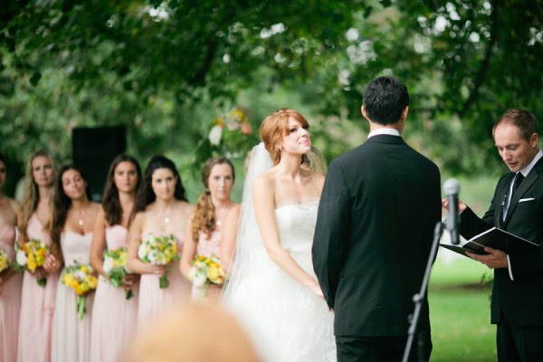 Heather wore an ethereal lace and tulle Vera Wang gown and white Christian Louboutin peep toes; delicate white flowers tucked into her low chignon set off her tulle and Russian netting veil and suited the wedding's garden party theme perfectly. Nine bridesmaids wore blush gowns from J.Crew and carried pastel bouquets from Beehive Events, while Franklin and his groomsmen looked handsome in classic black tie.