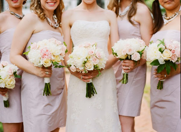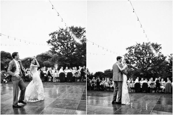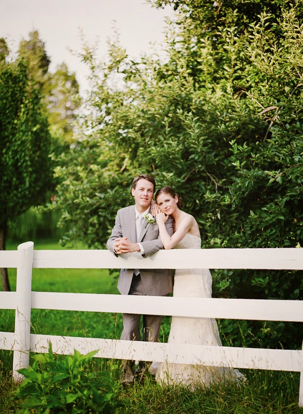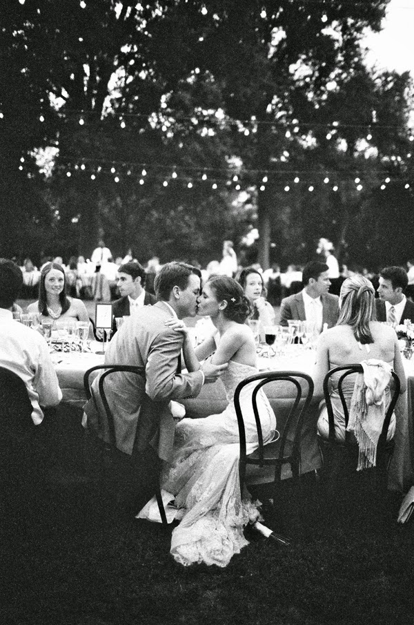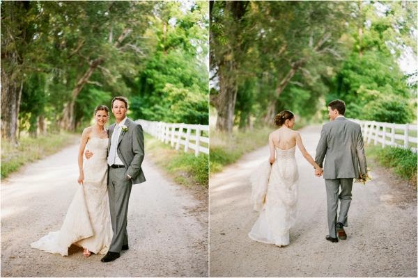 Heather wore a lace appliqué gown and Badgley Mischka embellished sandals; while her maids looked pretty in matching J.Crew silk taffeta dresses, Addison and his pals wore mismatched dark suits. The pair was married in an outdoor ceremony beneath some of the property's enormous oak trees. The bride's father officiated their intimate "I do's" under an arch covered in petal pink roses, grown and arranged by the groom's mother, a master gardener.