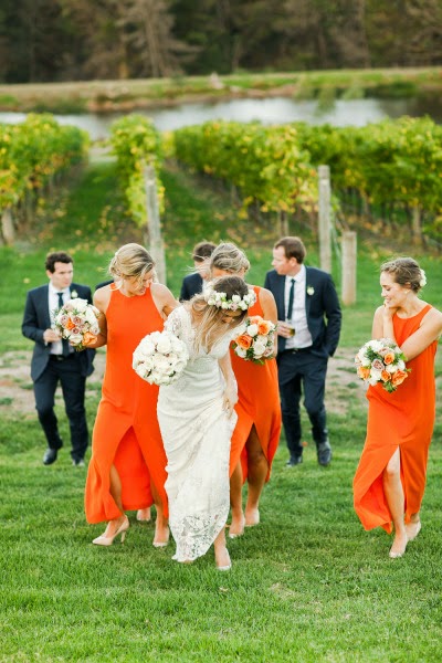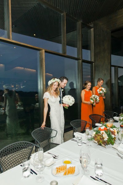 The bride wore a lace sheath flecked with delicate crystals by Temperley London; a pair of white Jimmy Choo pumps, a lush bouquet of white garden roses and a crown of white and mauve blooms by florist Tori Allen completed her elegant boho bridal look. Bridesmaids wore bold orange dresses by Willow and matching nude pumps from Nine West; their round bouquets were filled with white, mauve and bright orange roses with sprigs of rosemary and mint. Saville row tailor Spencer Hart crafted Hugh's suit, and the newlyweds attire was a nod to the years they spent living in London.