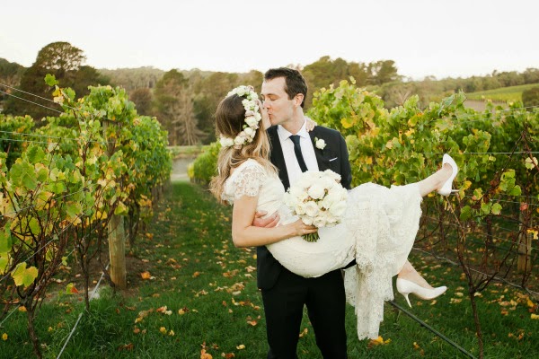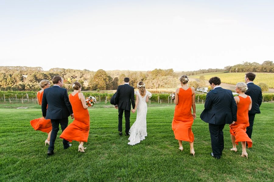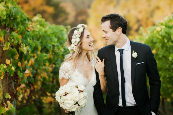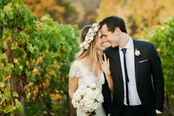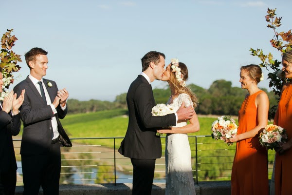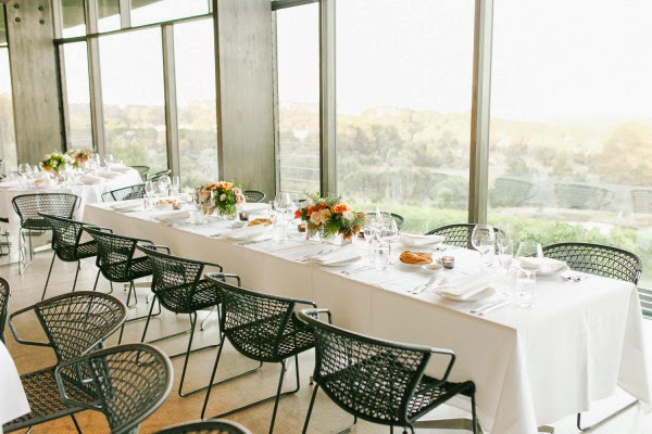 After exchanging wedding vows overlooking Port Philip Estate, the couple posed for photos in the vineyard. Dinner was served in the Estate's modern dining room, with white rose and fall foliage arrangements serving as a romantic foil to the concrete walls and structural furniture. Dinner and toasts followed, and after one last spin on the dance floor, Poppy and Hugh headed off on their honeymoon and into their life as husband and wife.