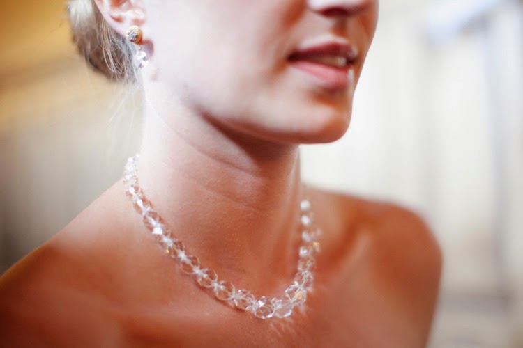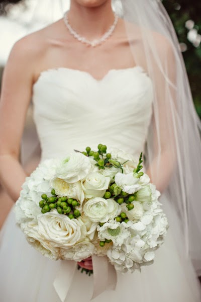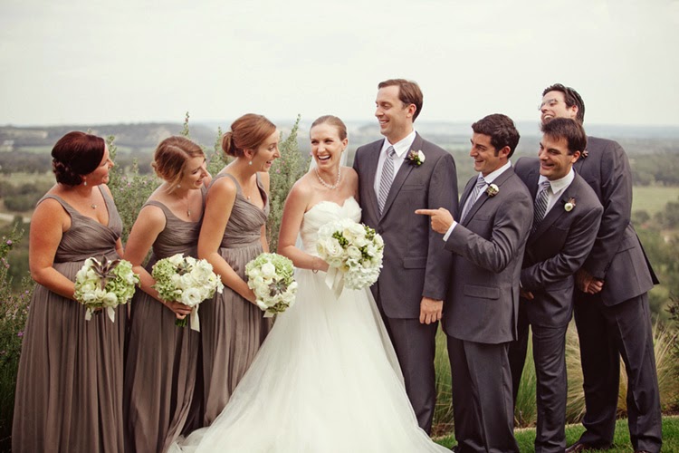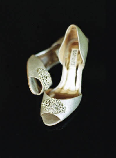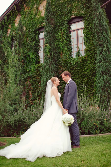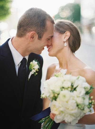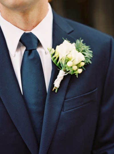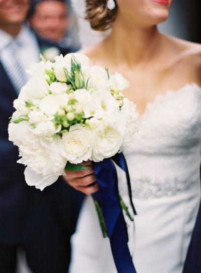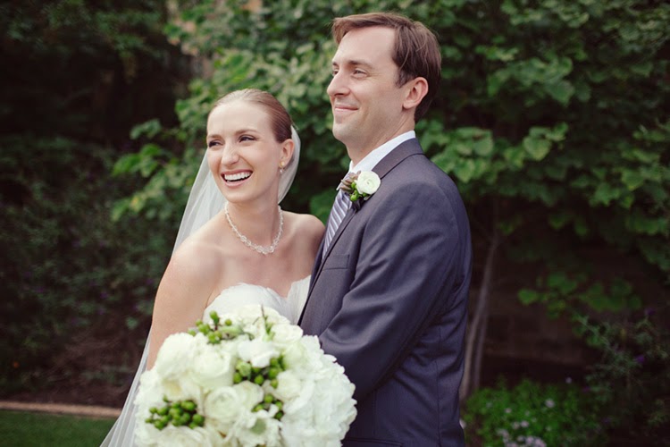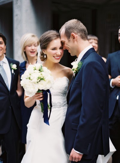 The bride wore a graceful Lazaro gown and a lace-trimmed veil; a crystal belt, sparkling comb, drop earrings and ivory Badgley Mischka peep toes completed her classic bridal look. Kelby's closest friends wore navy dresses of their choosing and nude pumps, and the ladies all carried white bouquets of roses, peonies, freesia, ranunculus, hydrangea and hypericum berries by Birdie. Jeff and his groomsmen naturally wore navy suits-the perfect compliment to the event's chic color palette.