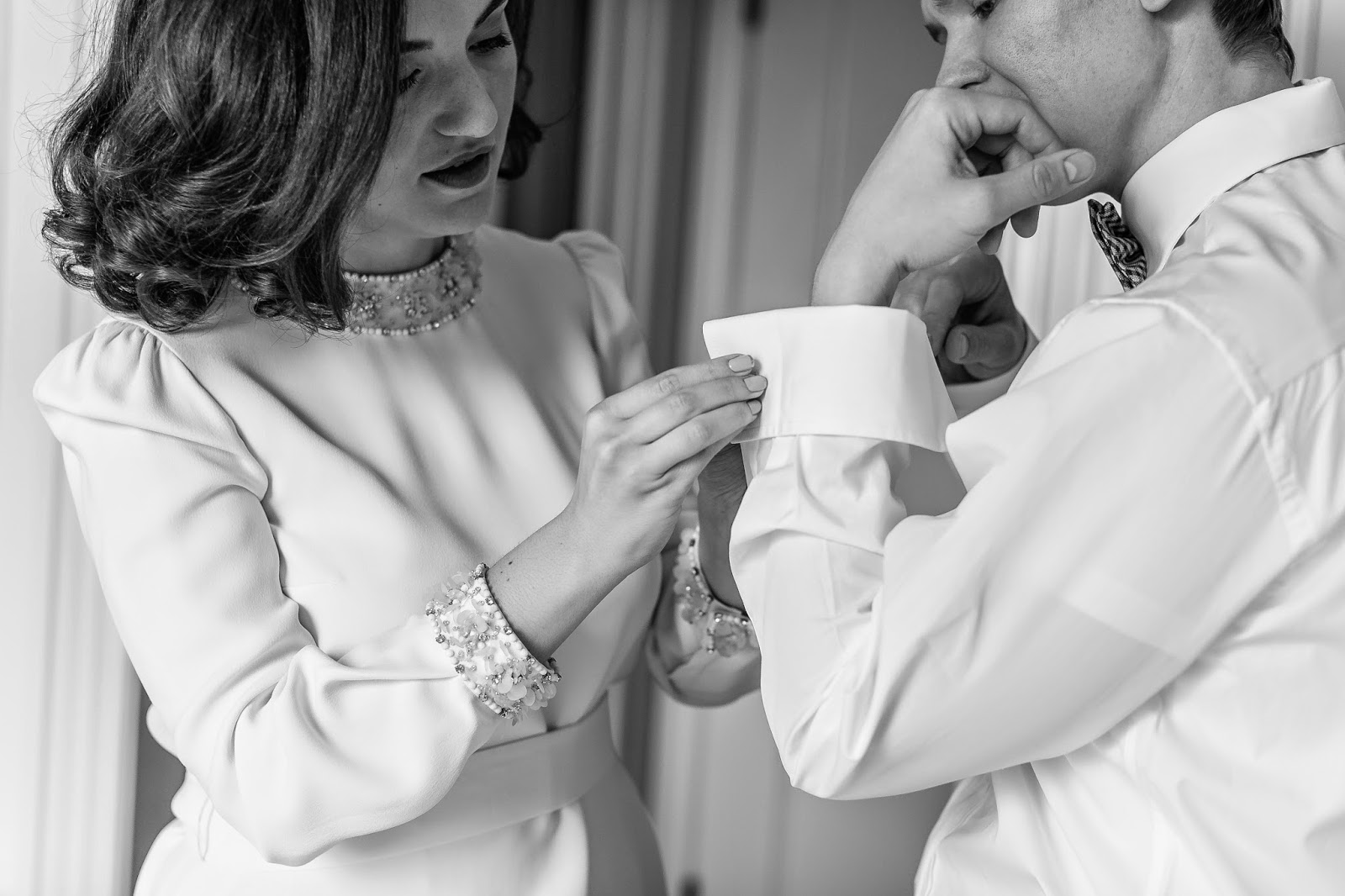 The bride wore Miu Miu and Manolos, and carried a lush bouquet of pink garden roses from Designs by Ahn. Konstantin and Alexandra dressed together in their suite at The Marlton Hotel before catching a cab to their civil ceremony at the Manhattan City Clerk's Office. After portraits in Central Park, the newlyweds and their guests dined in the dining room of Bobo in the West Village. The French meal featured oysters and rillettes served with Champagne, and the evening ended sweetly with a delicate wedding cake from Ladurée.