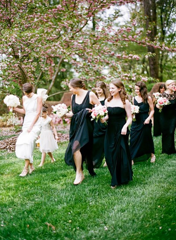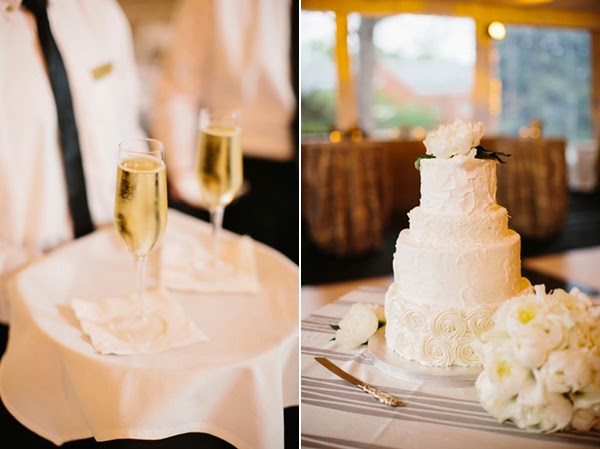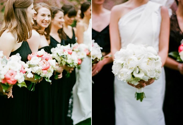 The bride wore a stunning Carolina Herrera gown, and wisely kept the rest of her look simple with a low chignon, drop pearl earrings and a pair of studded Valentino kitten heels. A structured bouquet of white peonies, hydrangeas and calla lilies by Watered Garden Florist was a perfectly appointed final touch. Heather's attendants wore long black gowns of their choosing paired with white and pink peonies posies, while Robert and his groomsmen looked dapper in black tie.