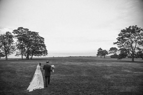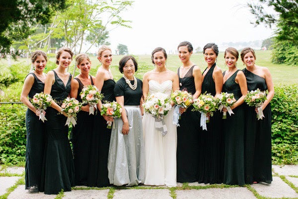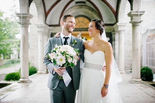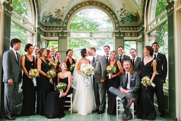 Marget wore a draped silk-chiffon Romona Keveza gown finished with a beaded crystal sash. Dusty lilac pumps, a simple drop necklace and a stunning horsehair veil from Chaviano Couture completed her romantic bridal look. Her maids selected floor-length black gowns and carried petite versions of the bride's spectacular garden rose bouquet by Hana Floral Designs. Seth chose a grey three-piece suite from Brooks Brothers' Black Fleece collection, and his groomsmen looked equally dapper in their own grey suits.