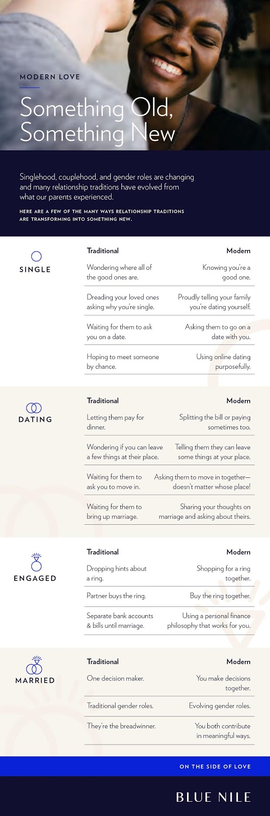 I love a beaming bride in a white dress and her handsome groom at the end of the aisle. But I also love midday ceremonies at City Hall, a bride in a killer pantsuit, grooms in matching getups, folks defining what marriage means to them—and staying single if that's what best for you. When we lose the judgement and simply support modern, empowering relationships in every form, our communities grow stronger and our world becomes a more beautiful place. That's why I'm sharing this guide from Blue Nile about blending old traditions with new ones, and making marriage modern.