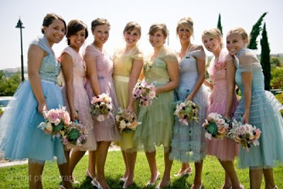 Using vintage prom dresses to outfit your bridesmaids? How adorable, and so very "Under the Sea"! To hell with matching; Your girls couldn't possibly. And a passel of pastel dresses makes everyone feel like they're playing dress up. What do you think, Kel?