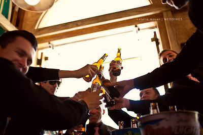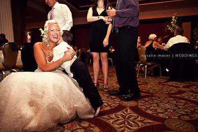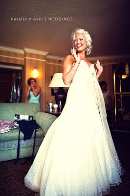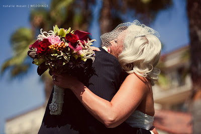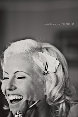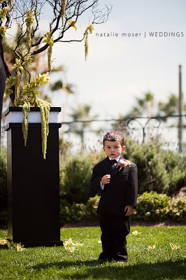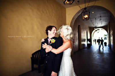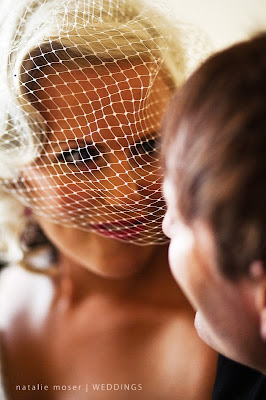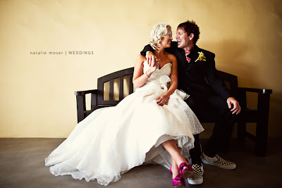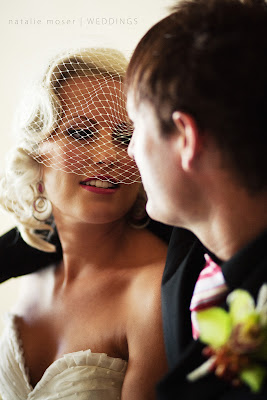 Danielle and Glenn's wedding, photographed by Natalie Moser, is not the kind of wedding I'd usually feature, but it's so beautifully coordinated and stylish that I couldn't help myself! Besides, all those shots of Dora were to-die-for. The pink and black Huntington Beach event was frankly fabulous, as was accessorizing her Dora with a classic birdcage veil. The bride and groom so obviously adore each other and had the most wonderful time celebrating with their closest friends and family. My favorite photographs were absolutely the portraits-Danielle is drop-dead gorgeous. That great image of Danielle grinning/saying "yippie!" actually placed top 20 in the Wedding Photojournalist Association's "creative portrait" category!