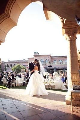 Adena is a bride after my own heart-she dreamed of an all-white wedding, and wedding coordinator Brooke Keegan delivered! The couple was married at the Grand Del Mar, a Mediterranean-style hotel in San Diego, CA in the on-site Elizabeth Capella. A cocktail hour on the terrace was followed by dinner on the lawn, and included some of the most jaw-dropping floral arrangements I've ever seen, provided by Elegant by Design. The rose-topped wreaths that decorated the bride and groom's chairs are absolutely breathtaking, and recall a garden party at Versailles. A jazz band accompanied dinner and dancing, and hundreds of lanterns light up the lawn as the evening drew to a close. Aaron Delesie captured every moment magnificently, and the guests never wanted to leave!