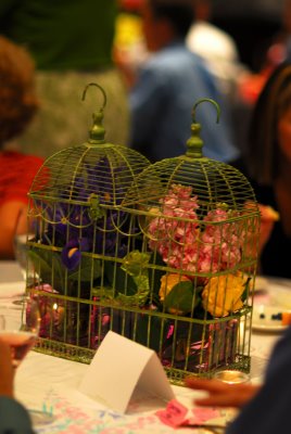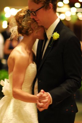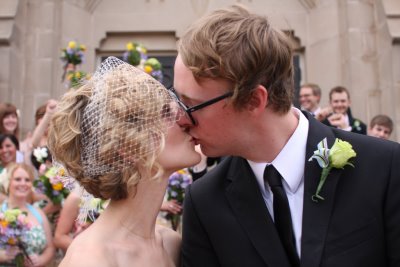 This adorable wedding felt like the perfect way to celebrate the end of June; charming flowers, sweet dresses and a whole lot of style! This Oklahoma celebration was truly a family affair; the bride's parents (and their parents, and their parents before them) own Mann's Flower Shop, so Katie and her parents designed the centerpieces, Mom did the bouquets and Katie's older brother took care of ceremony decorations. The bride wore a gorgeous Ramona Keveza dress (from the Fall 2008 Legends collection), while all ten of her maids wore frocks her mom sewed from vintage Vogue patterns circa 1950!
