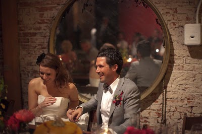 The caterer, Auntie Em, made British-inspired hors d'oeuvres like mini shephard's pies as a nod to Stefan's heritage, and served a family-style buffet at dinner that kept conversation flowing. Mini caramel apples and Halloween candy were a sweet touch, and the bride and groom skipped a traditional wedding cake in favor of cupcakes topped with charming ballerina and pirate figurines, spotted at a local knick knack store for 75 cents a piece!