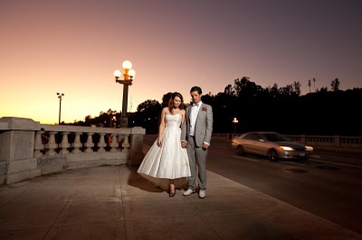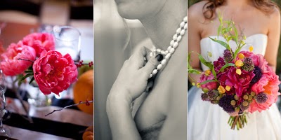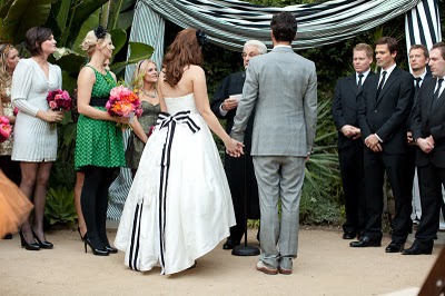 I have a confession to make about this wedding-I have been saving for almost a year, especially for today! Mary and Stefan's wedding took place on Halloween, so I knew as soon as I saw it that no matter how delicious, it would simply have to wait until the perfect day. I hope that seeing it now, you agree!So many beautiful weddings begin with an amazing dress, and this gorgeous bride's gown is a knockout. Mary designed it herself and comissioned Monaco Couture to execute this fashion forward gown with a sweetheart neckline, asymmetrical hemline and fabulous black and white bow. Along with a pair of sparkly Christian Louboutins and a Juicy Couture headpiece, Mary looked absolutely phenomenal, and she made sure her groom looked equally sharp in his Prada suit and coordinating black and white striped bow tie. This generous bride also gave a lot of thought to her maids' outfits, and was inspired by a May 2008 issue of Vogue to give the girls free reign. Obviously if you have such chic girlfriends, there's no need to make them match! The only girl she dressed was her flower girl; wearing an orange tulle tutu by Lily Anna for Girls, she made the most adorable pumpkin of the night!