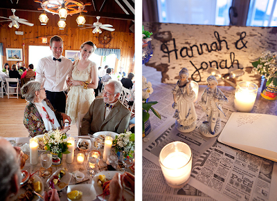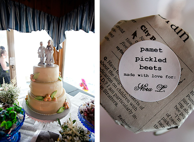 Cosmos catered the intimate reception, serving a clambake, lobsters and a raw bar, and Hannah and Jonah chose a Pimm's Cup as their signature cocktail-recipe is forthcoming. A marzipan cake topped with porcelain figures was whipped up at the Danish Pastry House in Boston, and guests took home jars of Jonah's homemade pickled beets, wrapped in newspaper that echoed the newsprint table runners.