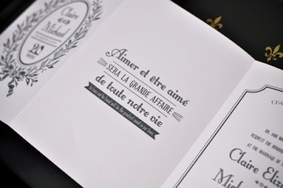 In case you Francophiles didn't get quite enough of macarons and ribbon yesterday, here's just a bit more Eiffel-tower inspired loveliness! First spotted on Oh So Beautiful Paper, this suite designed by Coral Pheasant was part of a gorgeous collaborative project. Tucked in a shimmering golden envelope lined with green and gold leaf rice paper, the blush colored trifold invitation was wrapped in golden cording and pale pink satin ribbon. If the Ladurée-inspired illustrations doesn't knock you off your feet, I don't know what will!