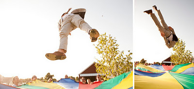 After the ceremony, the couple played lawn games like croquet and bocce ball with their guests, and encouraged everyone into canoes and paddle boats in the pond behind the barn. They also rented a giant parachute for the big day, and not surprisingly, being tossed up in the air by their friends was a highlight for the bride and groom.